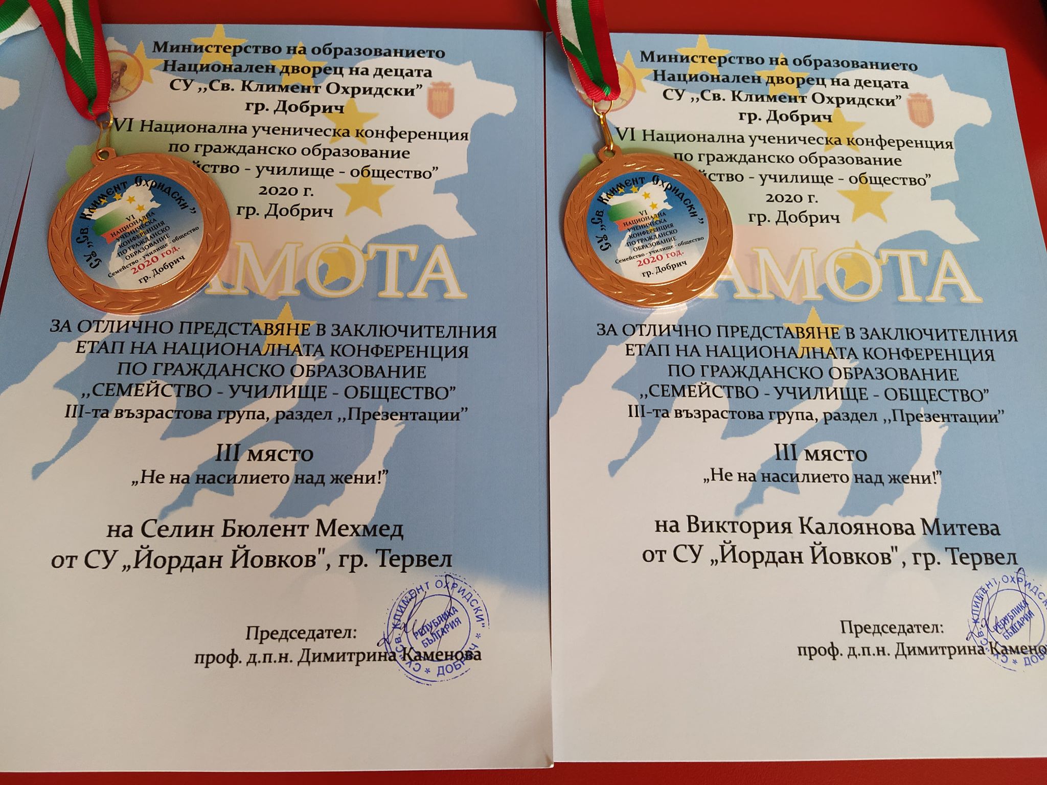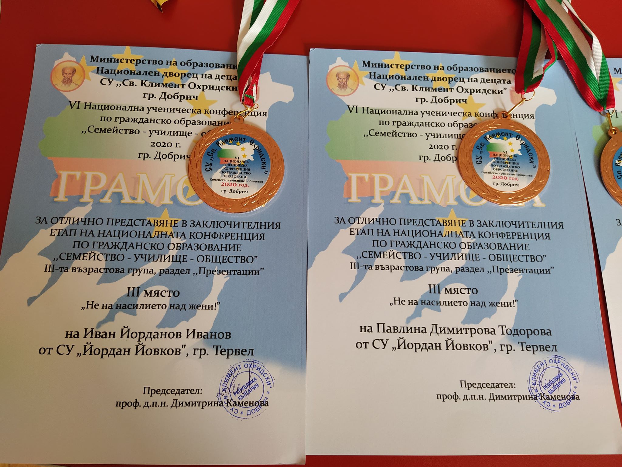 Те бяха отличени на Националната ученическа конференция по гражданско образование, организирана от СОУ „Климент Охридски“ град Добрич.