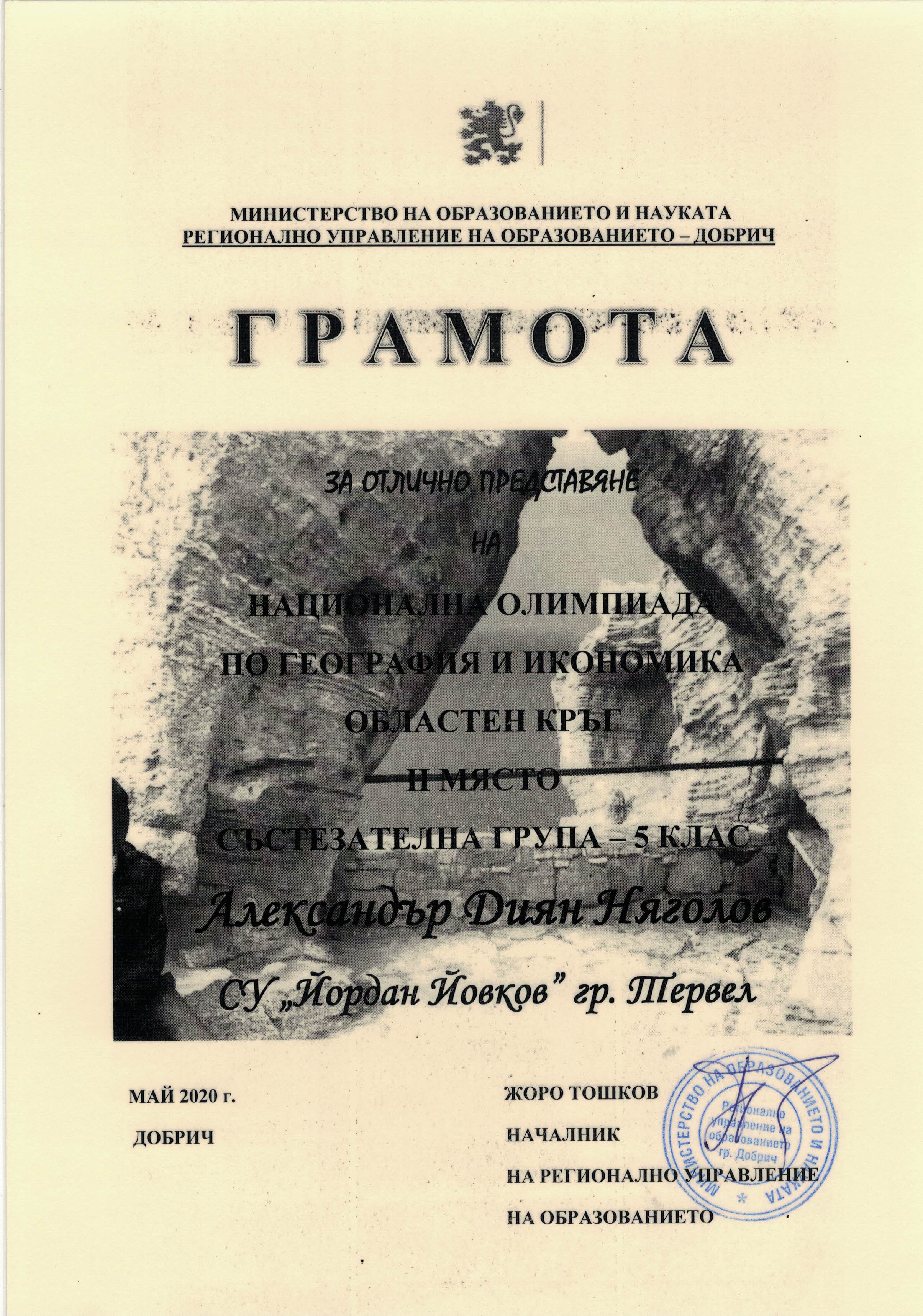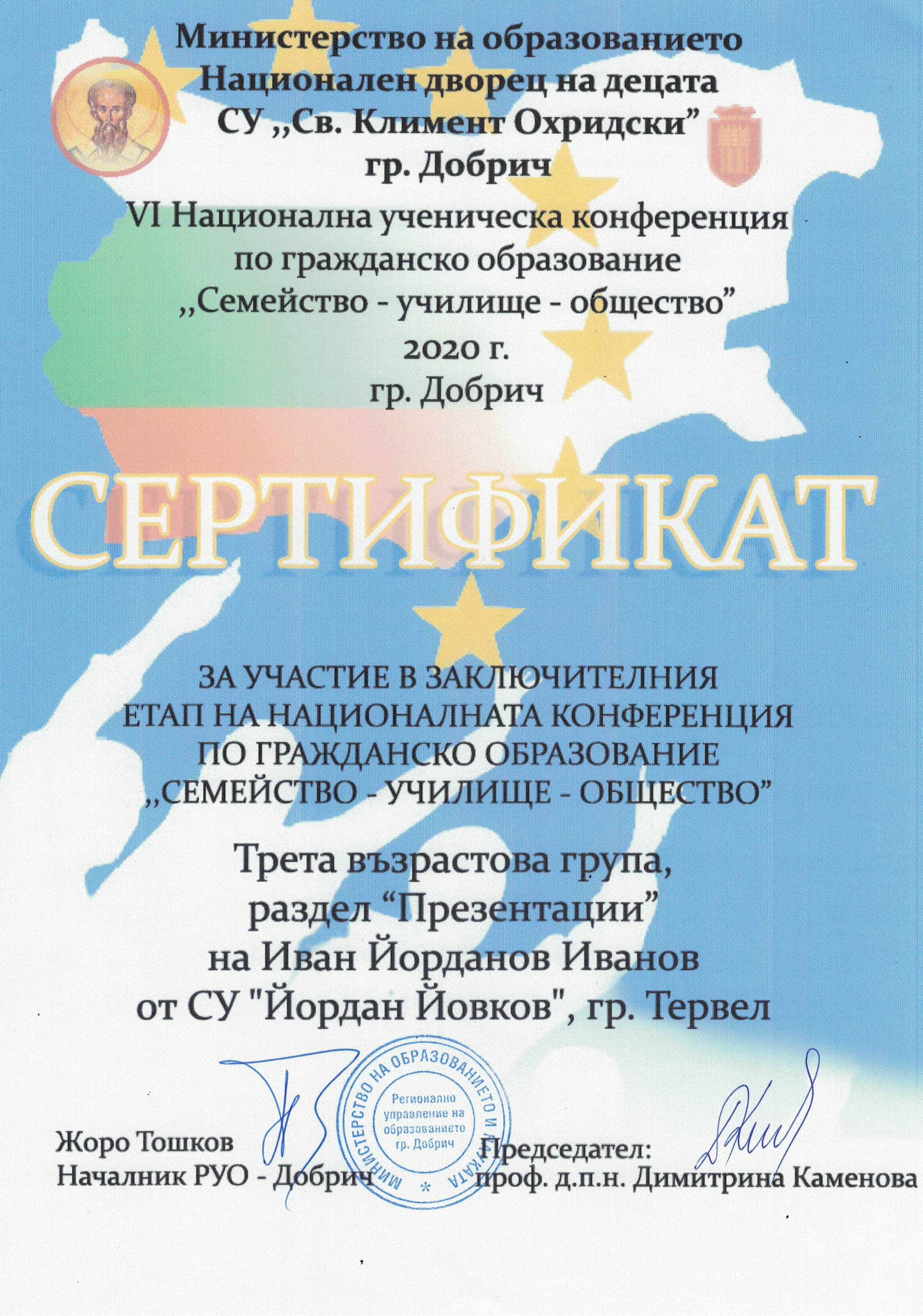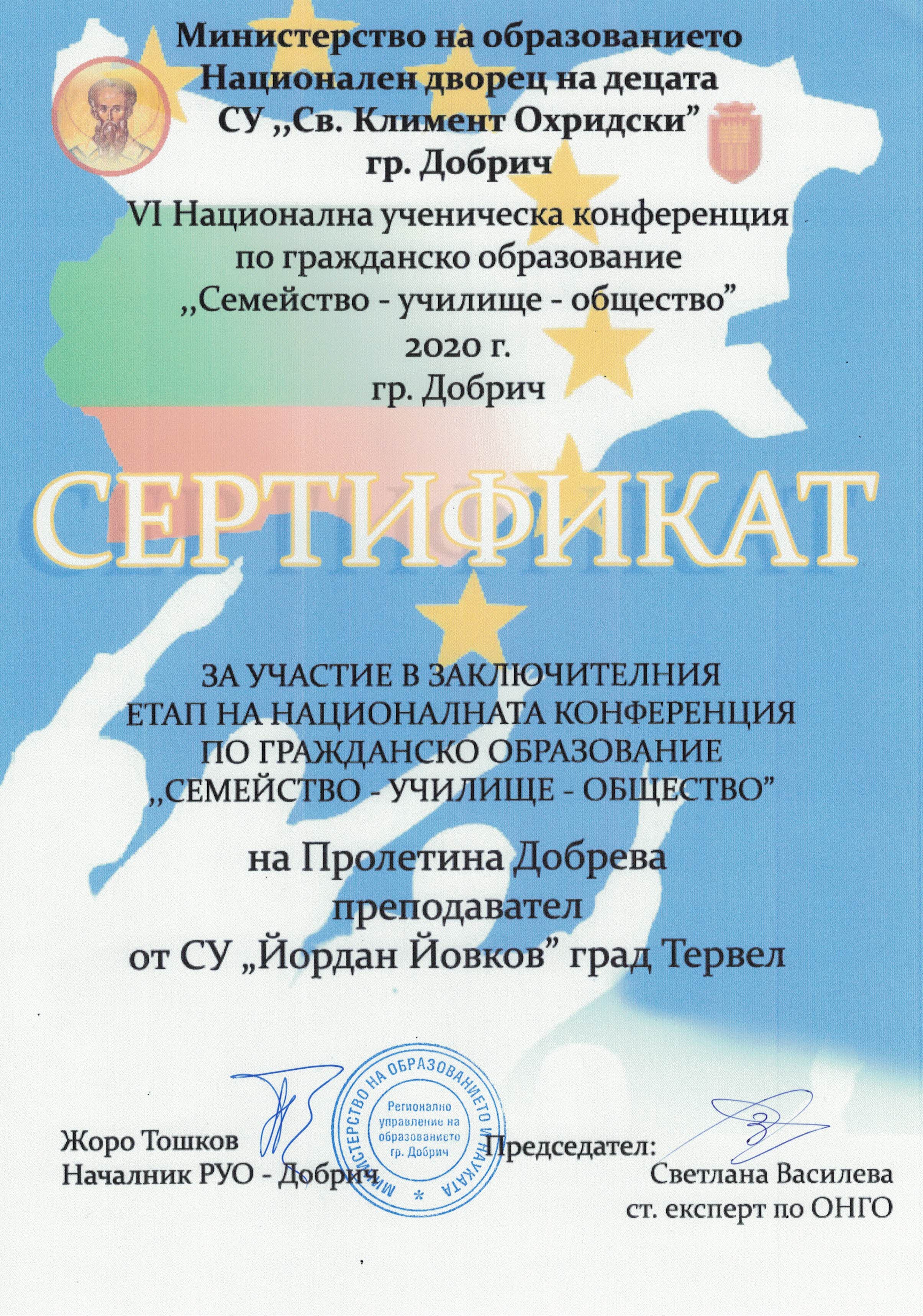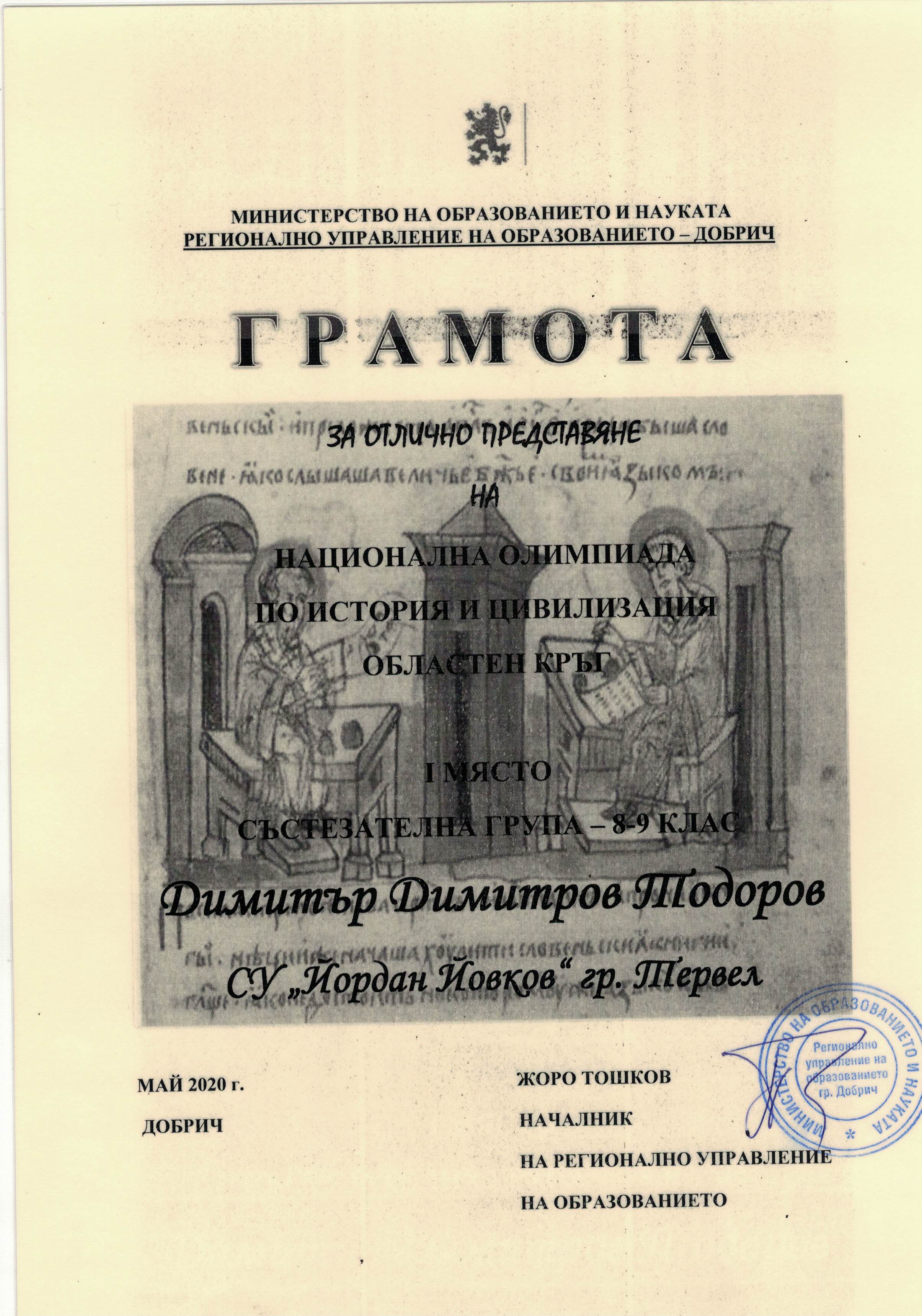 В Деня на Апостола – достойни за неговото дело, отборите от IХ „А“ и Х „А“ клас на СУ „Йордан Йовков“, гр. Тервел получиха признание и награди от Регионален музей Добрич и Министерството на отбраната за участието си в Научна ученическа конференция на тема „80 години от Крайовката спогодба и от връщането на Йовкова Добруджа на България“.