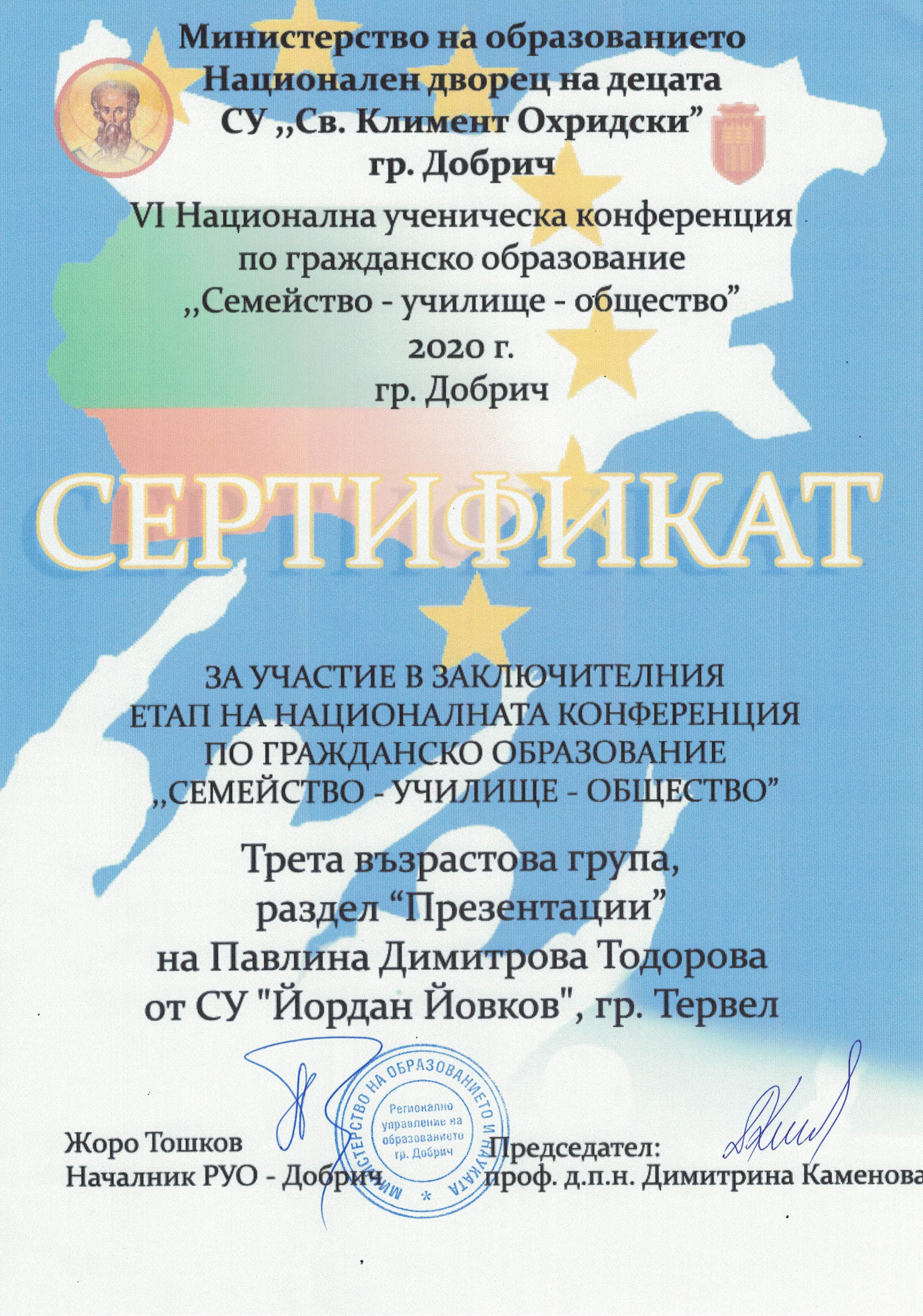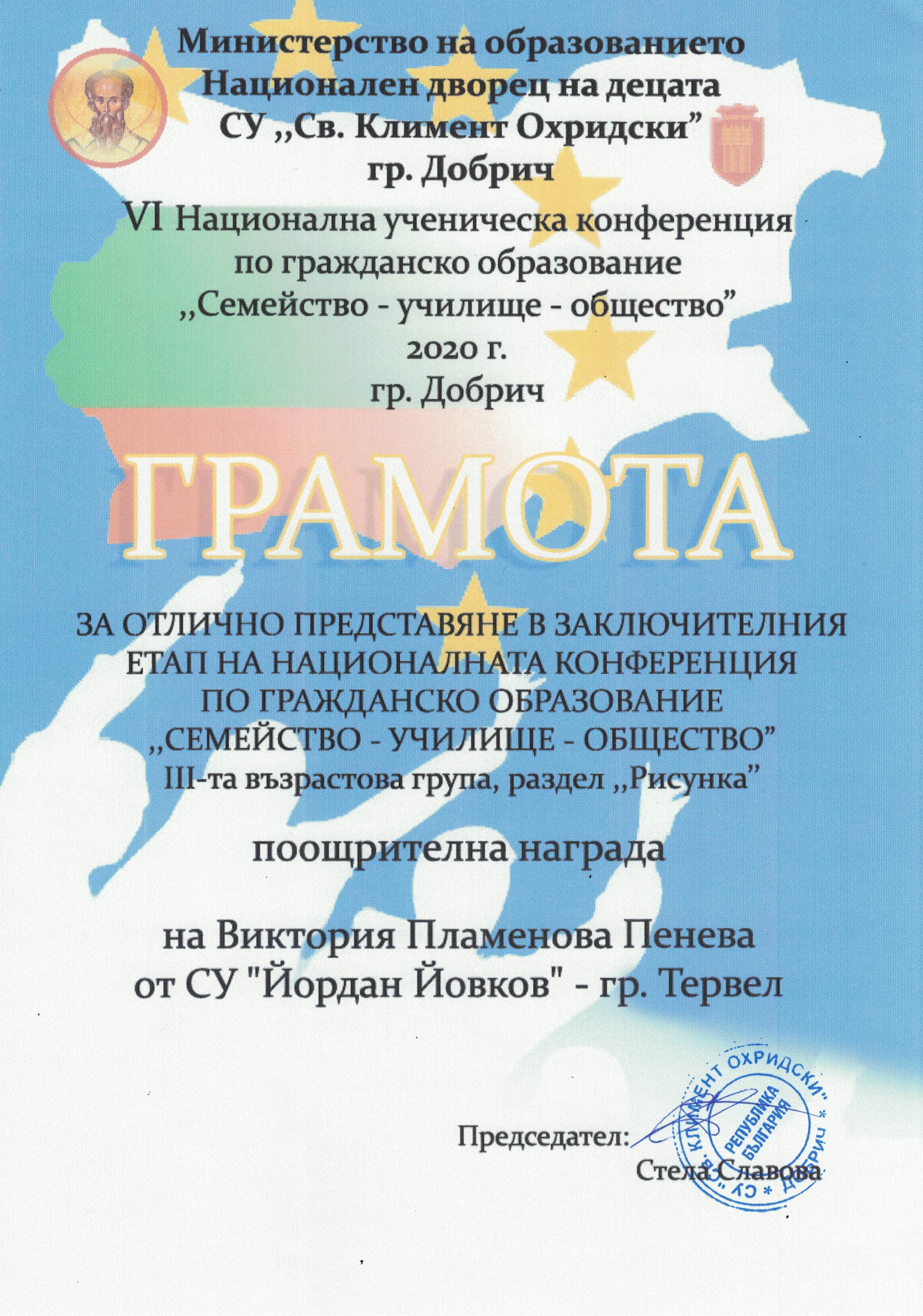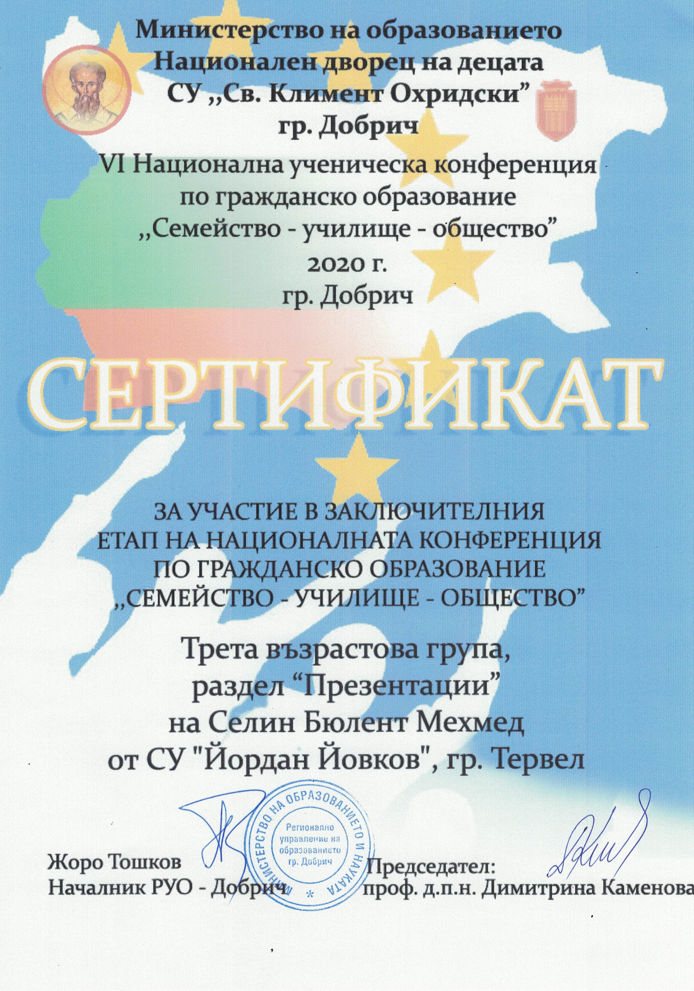 В Деня на Апостола – достойни за неговото дело, отборите от IХ „А“ и Х „А“ клас на СУ „Йордан Йовков“, гр. Тервел получиха признание и награди от Регионален музей Добрич и Министерството на отбраната за участието си в Научна ученическа конференция на тема „80 години от Крайовката спогодба и от връщането на Йовкова Добруджа на България“.