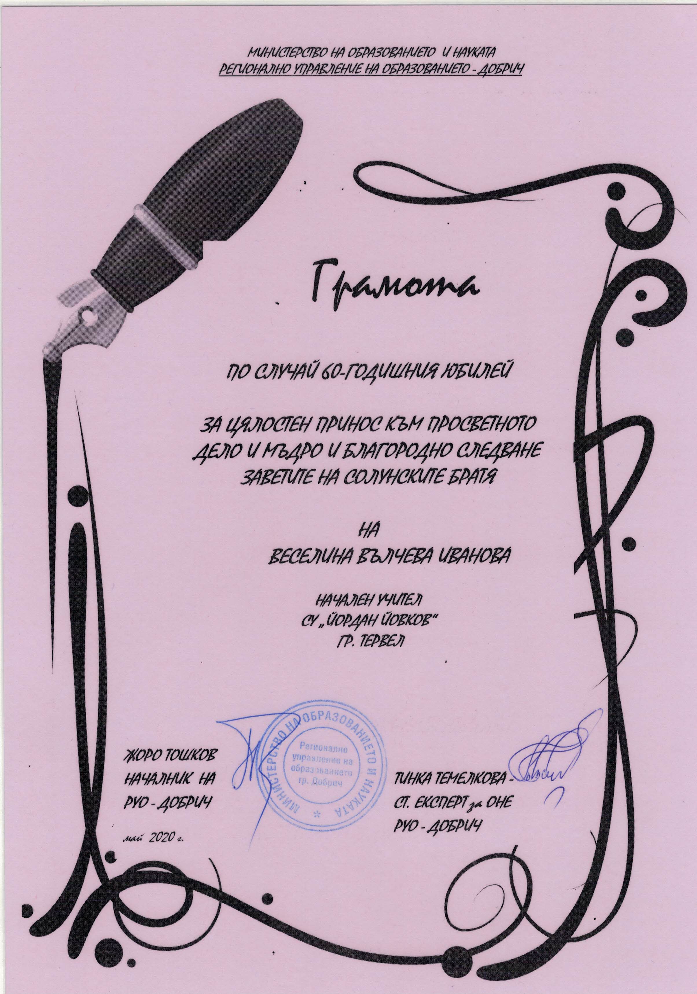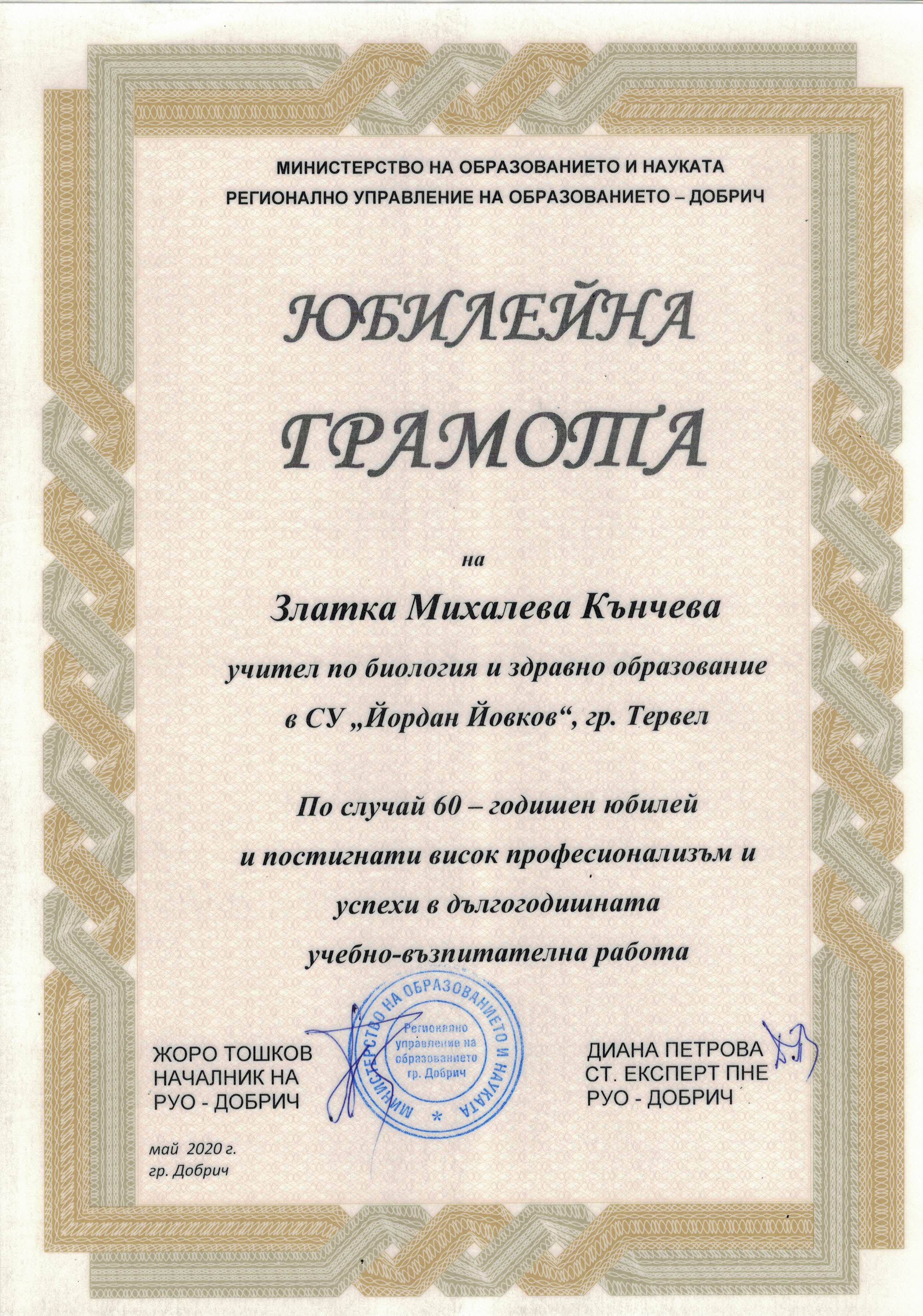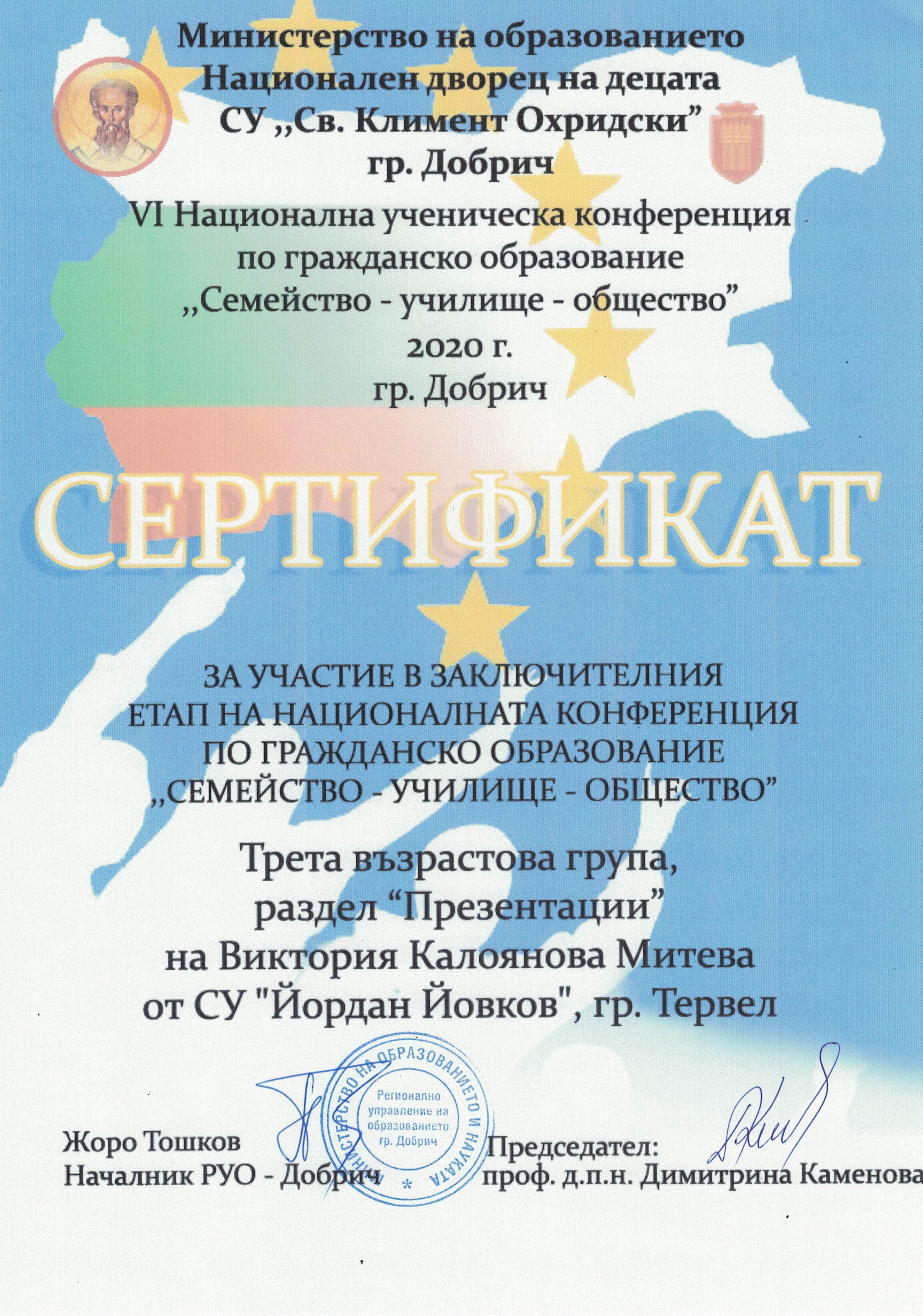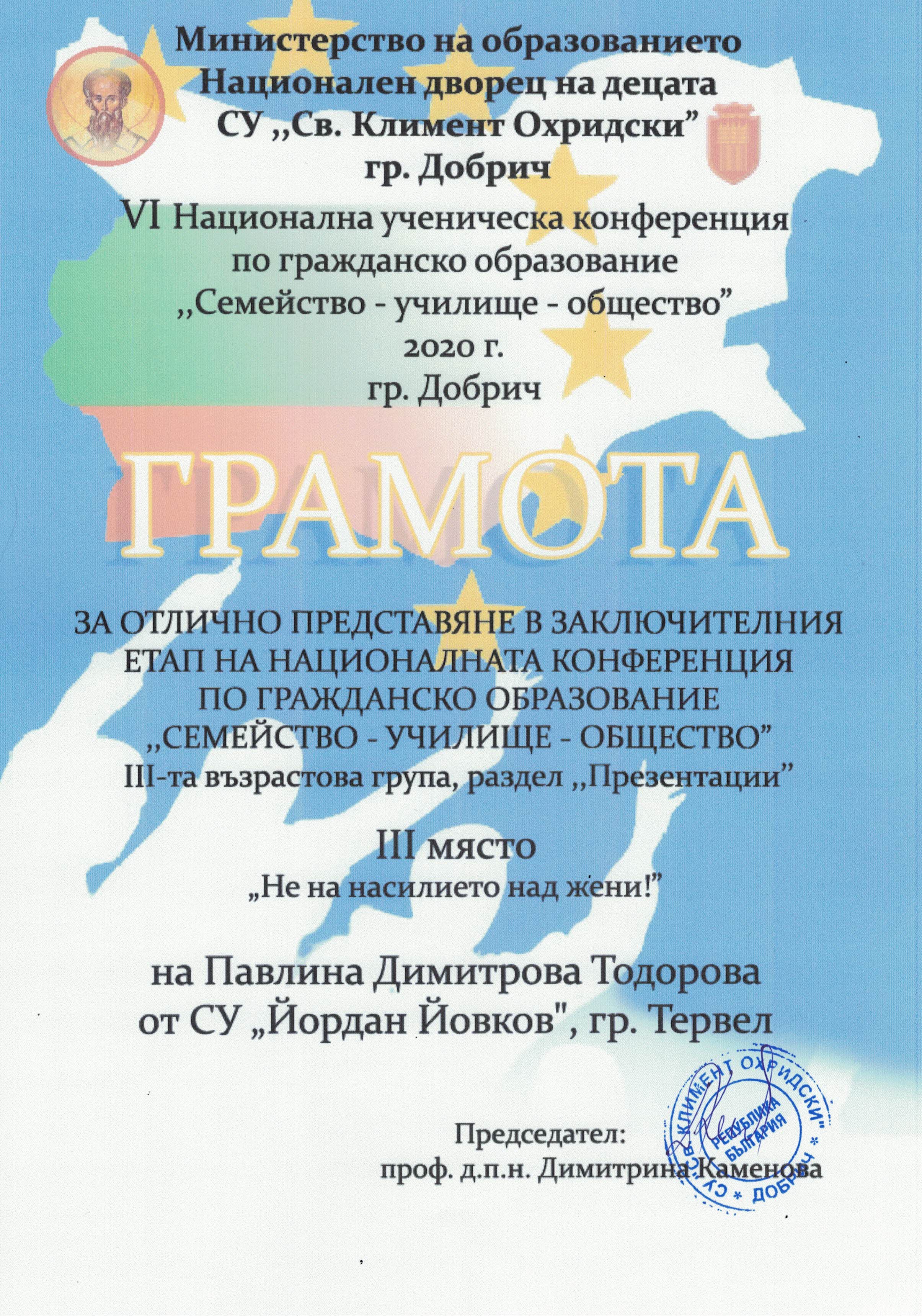 В Деня на Апостола – достойни за неговото дело, отборите от IХ „А“ и Х „А“ клас на СУ „Йордан Йовков“, гр. Тервел получиха признание и награди от Регионален музей Добрич и Министерството на отбраната за участието си в Научна ученическа конференция на тема „80 години от Крайовката спогодба и от връщането на Йовкова Добруджа на България“.