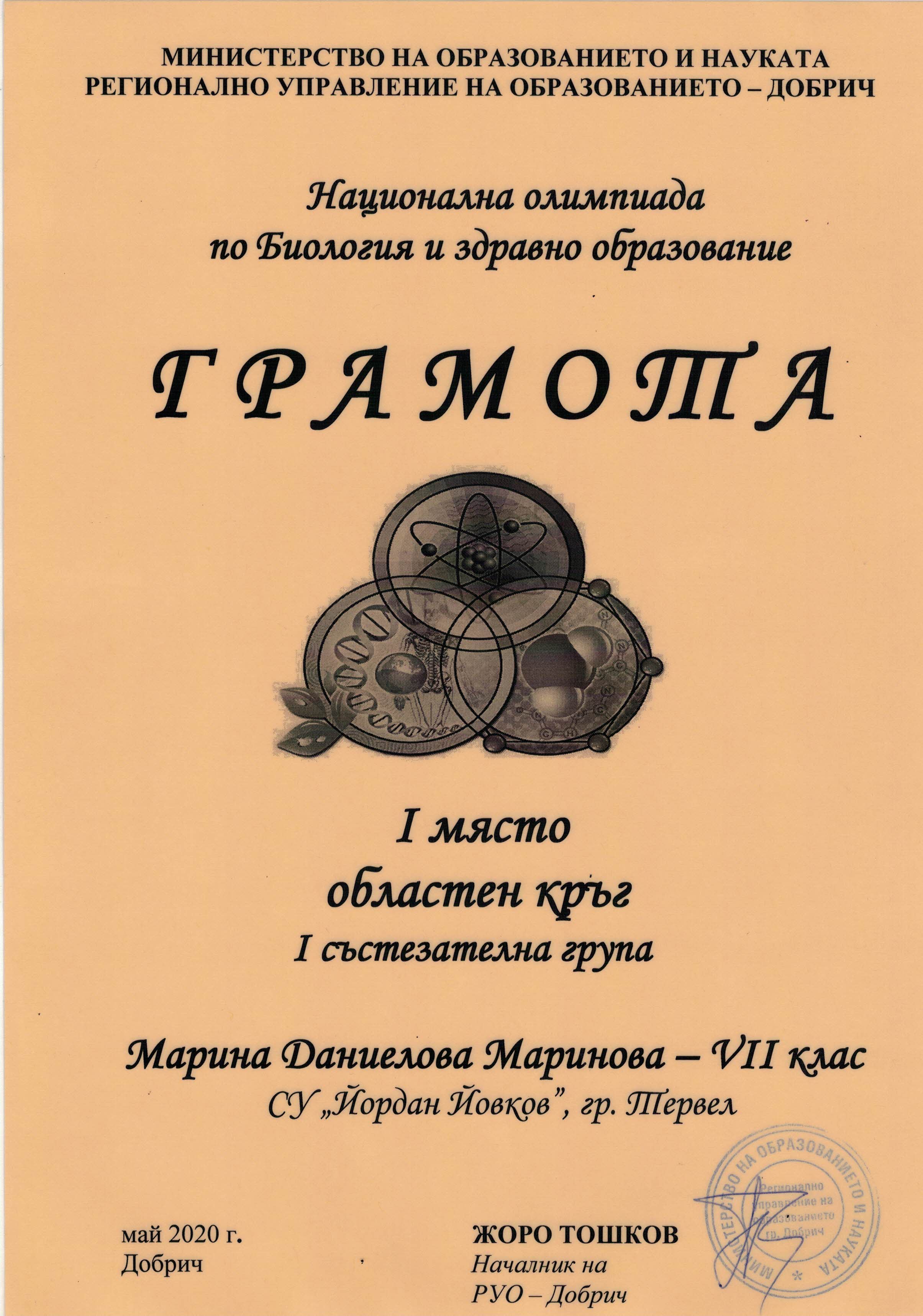 Да спечелиш най-високото отличие на фондация „Ценности“ и покровителството на президента Петър Стоянов е заслужено признание за учениците от СОУ „Й. Йовков“ град Тервел и ръководителите – главни учители Росица Стратиева и Стойка Жекова! Първа награда за изследователска работа и за литературна и филмова презентация на проучените и документирани знания за миналото на родния край! Първо място сред 170 участици! Това е повод за гордост – особено днес – в навечерието на 20-годишнината от създаването на ОДК „Малкият принц“ и 60 години извънкласна и извънучилищна дейност в Тервел.